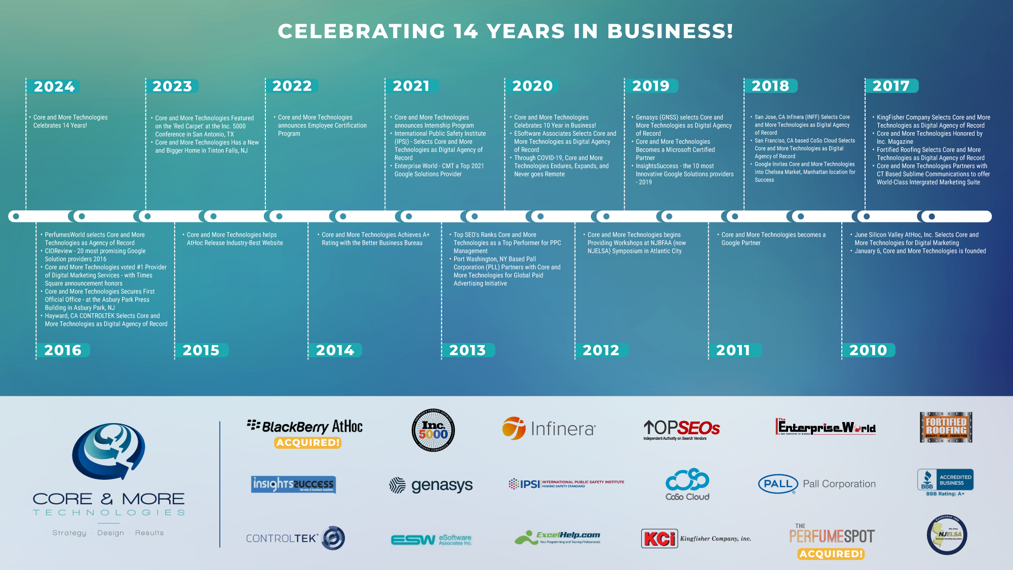 Sixteen years ago, Core & More Technologies was founded with a simple but ambitious belief: that great marketing should be accountable, adaptive, and built to drive real business outcomes – not vanity metrics.